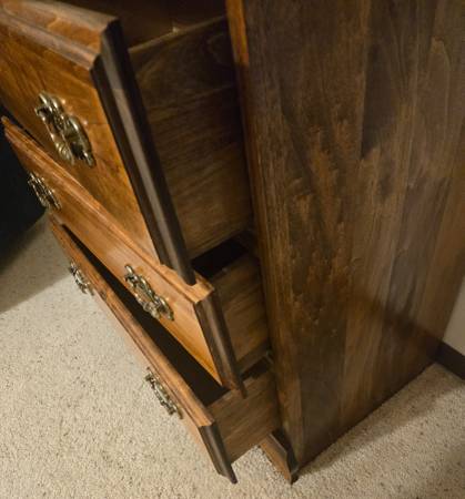 On the bottom, there are 3 drawers for storage. The drawers pull out best when both handles are used to pull at the same time. There is no center guide due to its age.
