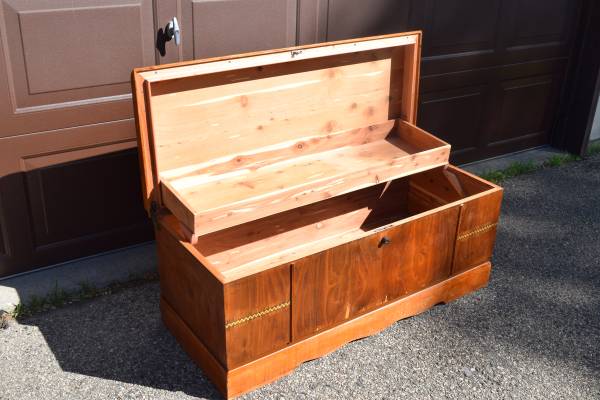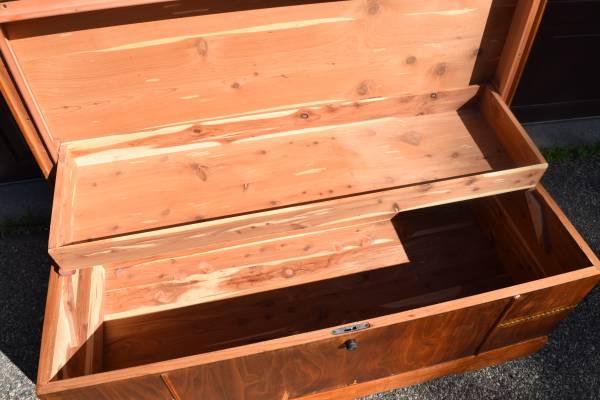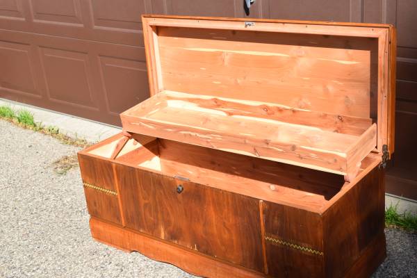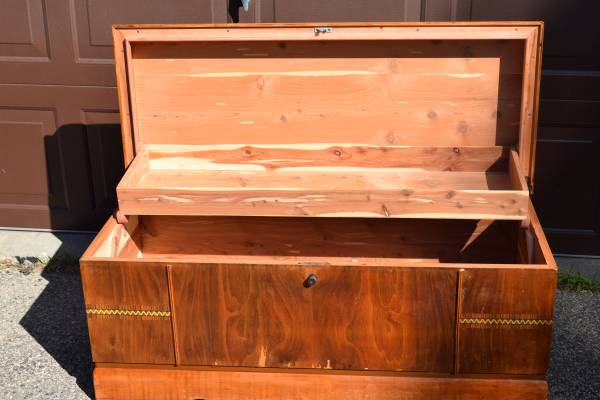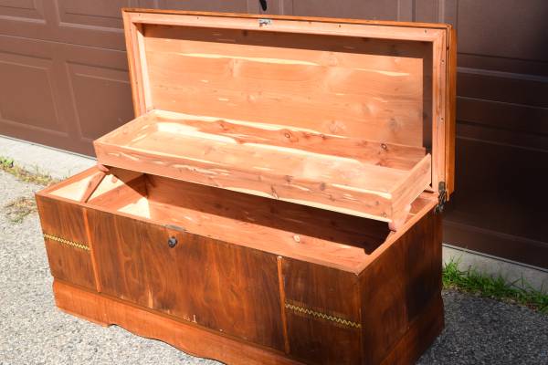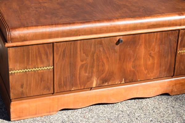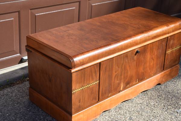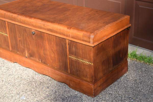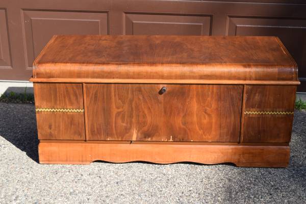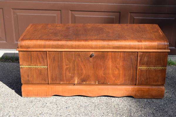 Waterfall Style Cedar Chest, from the 30's and 40's. Has a small area of missing laminate on front bottom as shown. Size is- 44" wide, 18' deep, and 20"high. Cash only. If interested please message,...