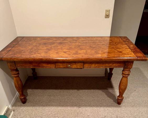This library table is a rare find! Made from beautiful solid burl wood. In excellent condition. Beautiful attention to detail in the craftsmanship. The finish is in excellent condition. Carved table legs and Crystal drawer pull with drawers on both sides of the table. This table makes a beautiful reception desk for a professional or executive office, a unique show piece in your home or even a dining table. Well cared for in a smoke free environment. Not certain if it's maple or cherry burl wood, either case, it's a beautiful well crafted piece of artful furniture.