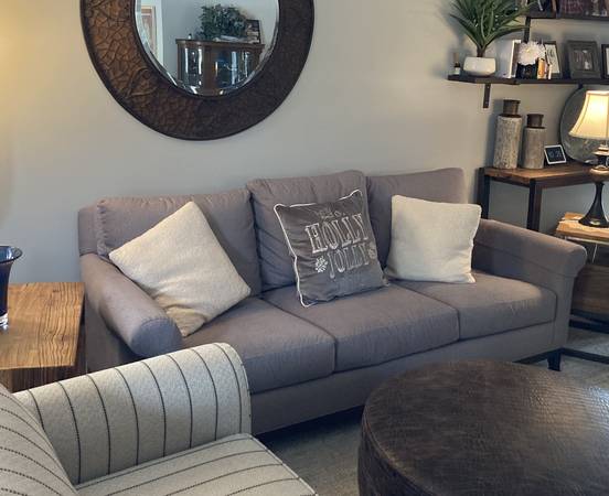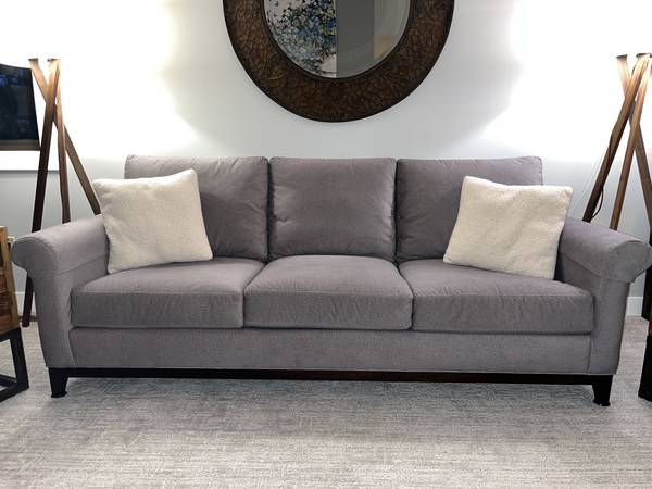 Beautiful custom made Lee Industries sofa. Grey color, soft, washable fabric. No pets, no kids, no smoking home and barely used. Love this couch but it doesn't fit well in the room.