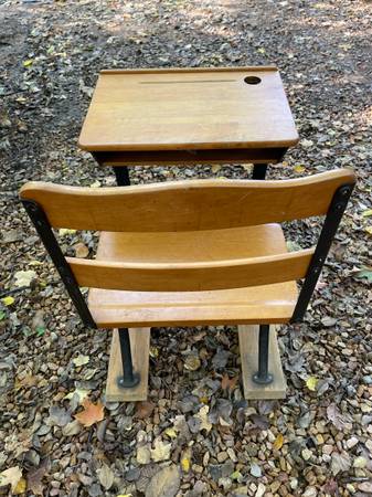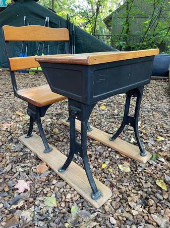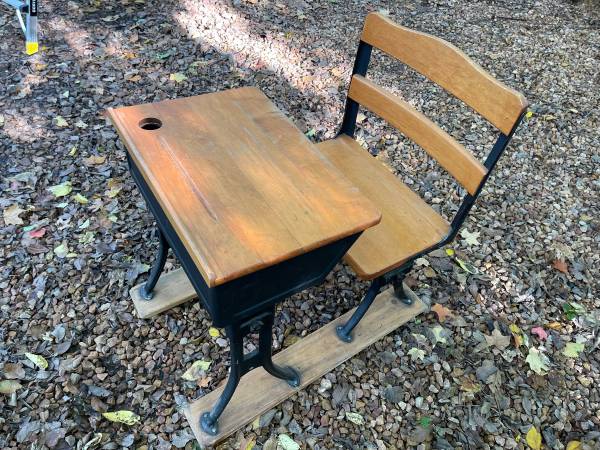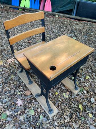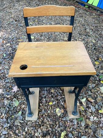 Antique school desk in great shape. Could be used for homeschool activities, or simply a place for your kids to work on their art instead of at the kitchen table! Sold As-is, Cash only.