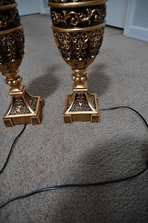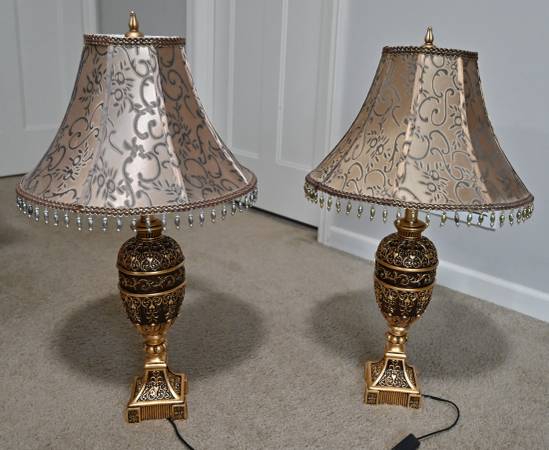 This is a beautiful set of 2 table lamps and a matching floor lamp. All are in very good condition. It is imported and require an adapter to plug in. Adapter included. $250 cash