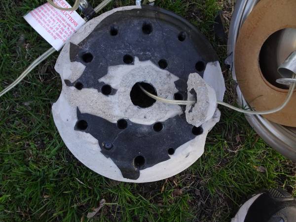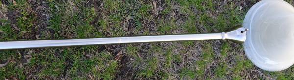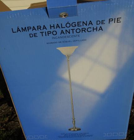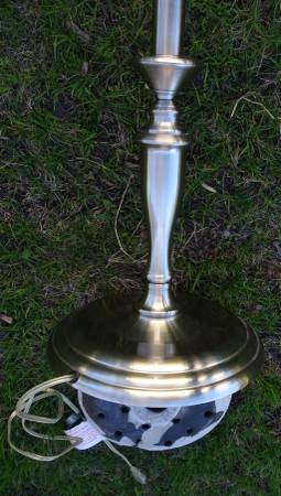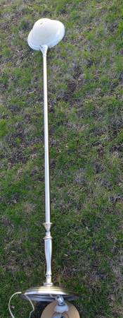Hampton Bay Torchiere brushed nickel floor lamp. Seventy-two-inches high with a thirteen-inch diameter base. The shade is glass with a frosted alabaster finish. I do not know if you can still buy these lamps with a glass shade - they all seem to be plastic. The shaft unscrews into three sections - easy to dismantle and move. This lamp works but has one odd problem - the concrete weight in the base has disintegrated. Otherwise the lamp is in perfect condition having sat in the corner of my smoke, kid, and pet free bedroom for years. If you have a large disc of cast iron or steel that would fit in the base you could fix this lamp. I have the original box and instructions. Three way switch for an incandescent bulb, but I found it works fine with the switch in the 100 watt position with a LED bulb operated from a wall switch.