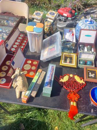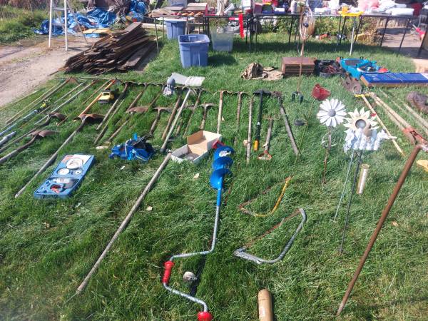 Tools , shovels, rakes, post hole diggers, (auger and regular), hoes, spades, garden weasel, pallet breaker, sledge hammers, axes one double header, jewelry, Asian collectables, pabst price sign, scuba fins and jacket, a few guitars, some misc. Open from 8 am until 5 pm.