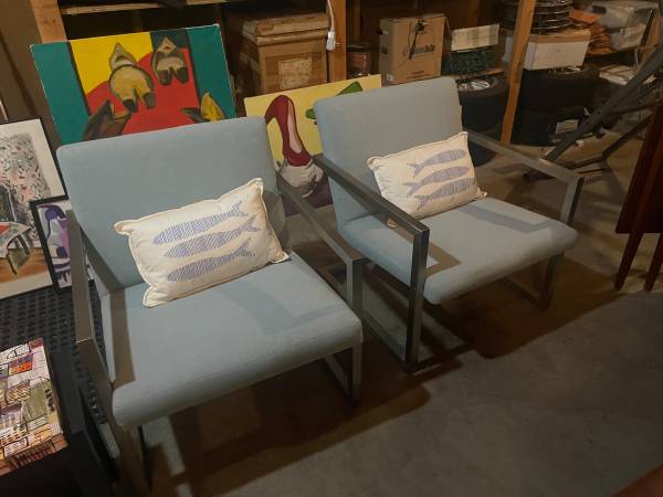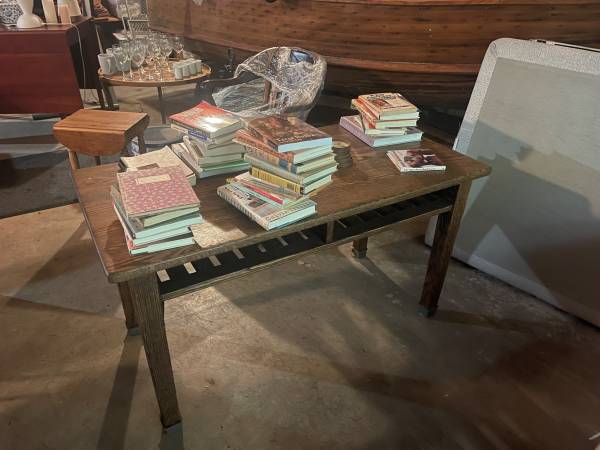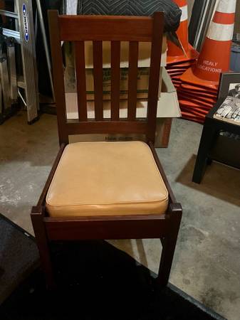 Garage Sale Friday and Saturday featuring Room and Board couch and cool chairs, a mahogany Stickley Chair, low oak desk with brass feet, Cherry dining table, lamps, art, glassware, maple full bed,...