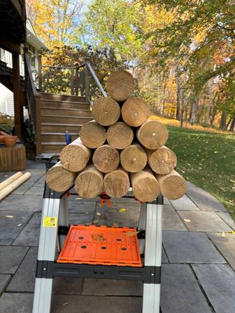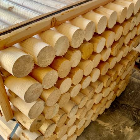 Looked high and low for constant diameter doweled poles (lodge poles) to be used for horse jumps. Everything available in Midwest is tapered and meant for fencing. Everything from down south was pre finished and up to $120/rail by the time it was shipped to Minnesota. Ordered from the state of Washington from large lumber facility. Have a shipment of 10’ x 3.5” pine lodge poles. They arrived a little rough from the doweling process so we sanded them to be fairly smooth.