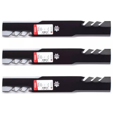 Oregon 92-616 G3 Gator Blades for 48" John Deere deck. These G-series blades are better than OEM blades in every respect. They are much thicker, they have a 6" cutting surface (twice the size of the 3" cutting surface of the OEM blades), and behind the cutting edge the G3 has sharp raised teeth to mulch the cut grass and propel it forcefully out from under the deck. I took that last photo for comparison so you can see this.