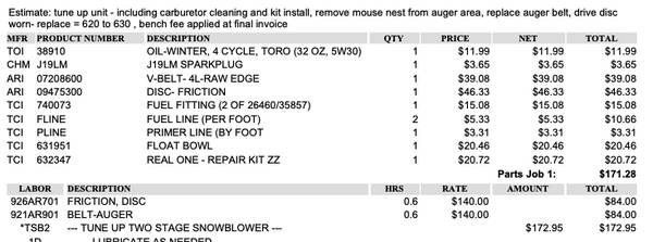Ariens ST8 24" snowblower. I've been using it for many winters. It runs well for its age if I run it at full speed. I do think the fuel line shut-off needs replacing as it drips and to get it running really well a few other things would be nice. I took it to a local shop and had they quoted a few things. I decided to not bother so I'm selling it.