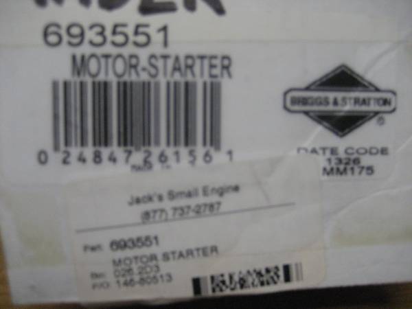 Briggs & Stratton Starter #693551 12volt New part #593934 Not China junk New starter used one season Paid 159.29 from Jack's Small Engine Excellent condition, Like new No issues $100.00 Call or...