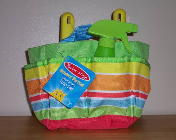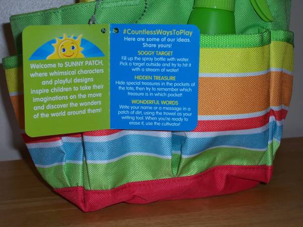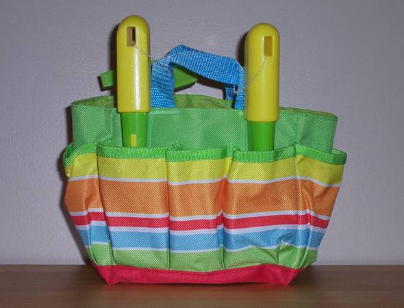 Brightly patterned tote, complete with child-sized garden tools. Tote made of durable fabric; garden tools-shovel, rake, and spray bottle, made of easy-clean plastic. Encourages imaginative play, outdoor exploration, and develops gross and fine motor skills. Ages 3+. Tote is approximately 9"Long.