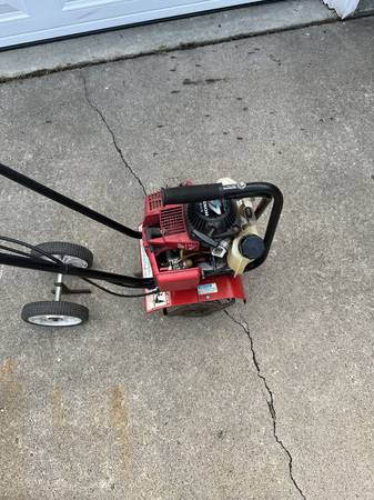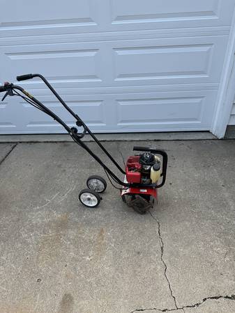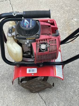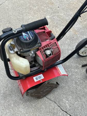 Mini-tiller/cultivator byHonda. GX31 1.5 HP, 4 stroke engine . Comes with the tiller blades and transport wheels. Handles can be folded downward for storage. We moved to Minneapolis and our garage space is too small for all of our things. The tiller was last used in 2024 and needs to be tuned up before use. The tiller has not been used a lot. It worked well in the past, although we found that it should not sit for long periods with gas in it.