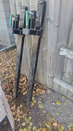 New clamp on bucket forklift lift forks With adjustable stabilizer center bar not pictured. 4ft 11inch long 3ft 10inches usable fork $200 Reply with your phone number for me to call you at. No...