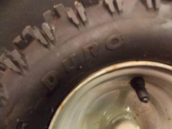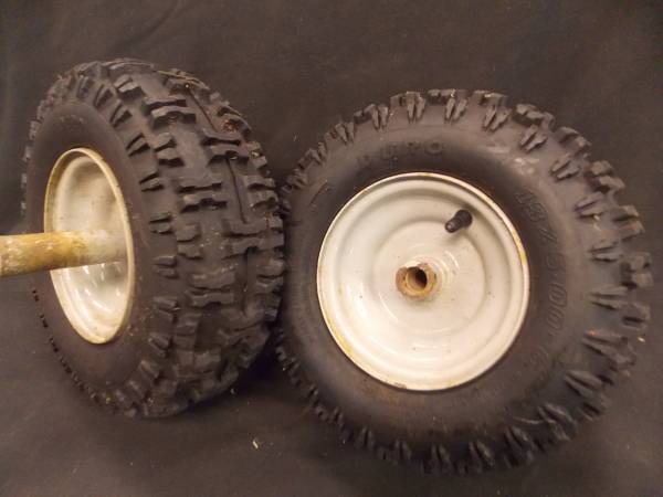 Here I've got a pair of New SnowBlower Rims and Knobby winter tires. These both hold air great. Sorry, they got a few areas of light rust on the wheels(They were stored in a leaky shed)..You can use them on your Snow Blower, or make a Garden or Hunting Trailer or tow behind utility Cart. Maybe your Child wants to make a Go-cart ,they would make great Rear Tires for some mud or dirt riding.The Tires alone are $59.99 each New, so here you get 2 New Tires and Wheels for that price. The solid axle you put thru the Wheel axle hole can be 7/8" or, it's Teflon Tube shimmed down to 3/4" now. One side sticks out 1" and hase t a thru bolt hole and the other side extends 4" from the wheel center. Call (952)854-5 seven eight six