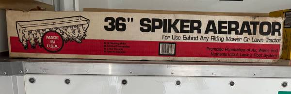 All steel 36” spiker aerator brand new in the box. Made in the USA. Used behind any riding lawn mower or lawn tractor. Promotes penetration of air, water, and nutrients into a lawns root system....