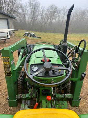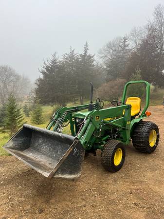 John Deere 650 diesel tractor with loader in great condition. Tractor has been well cared for, has four wheel drive, front, mid and rear pto, and power steering. 923 hours. Six one two, two five one...