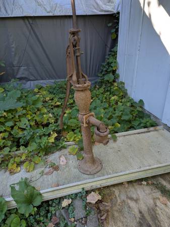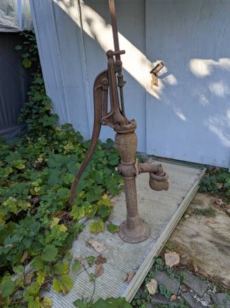 Antique hand operated well pump, excellent condition with all above ground parts including a scoop to lead the water into a pipe. It would look great next to a shed or in a garden. This pump came off my grandfather's farm in Langdon, North Dakota about 60 years ago. I had it displayed in my yard but it is time for it to go to a new home. Its about 5 feet tall depending on how you measure it, to the top of the handle or to the rod that sticks out. It is pretty heavy but one person can lift it. It should be bolted down to a secure base as it will tip over easily when standing alone.