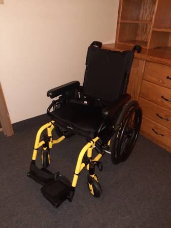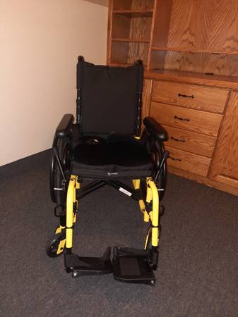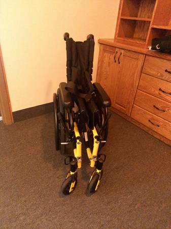 Sized for child or small adult Seat is 14” wide X 15” deep Seat ht 17 ½” Removable footrests Quick release rear wheels Foldable for easy transport Cash only Pick up in Brooklyn Park. Mon – Fri...