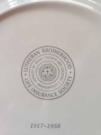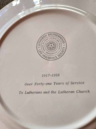 Lutheran Brotherhood anniversary plate from 1958 with gold trim