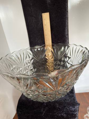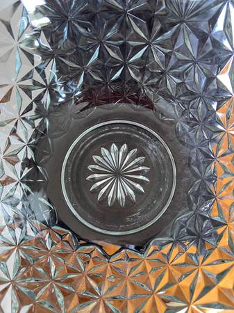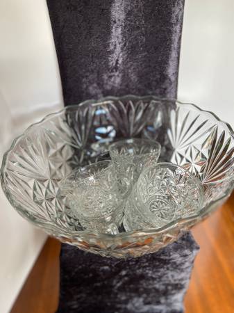 This is a vintage punch bowl set featuring a diamond and fan pattern. There are six cups and one has minor flaw as shown on the picutre (small chip). The bowl set is heavy as the glass is sturdy and durable. I have seen individual cups on sale at eBay if more cups in same pattern are needed. (The color is clear - colors in the glass in the pictures are from the sunlight shining from the window!)