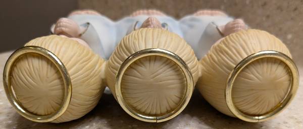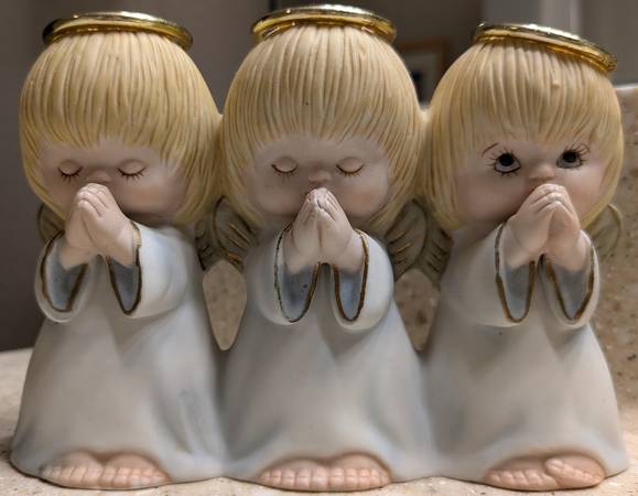 – Ceramic – Matte finish – Shiny metal halos – Trio of praying angels – Vintage figurine – Approx: 3-1/2” high x 5-1/2” wide x 5-1/2” deep – Excellent vintage condition – Non-smoking household Cash...