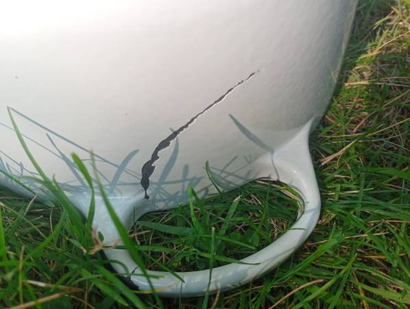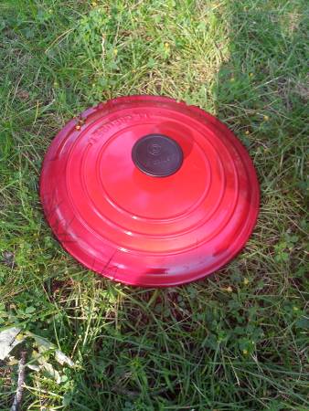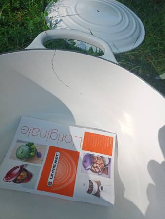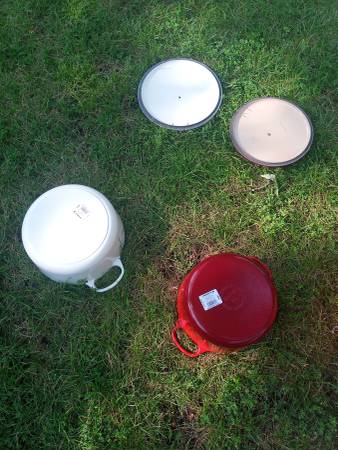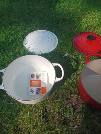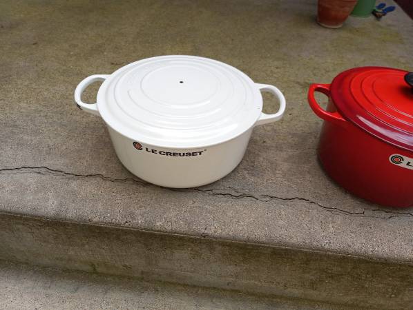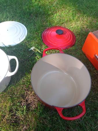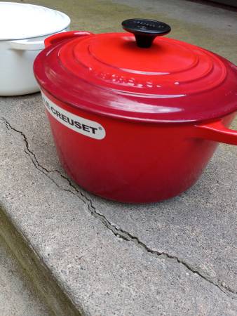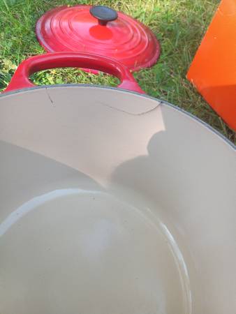 Le Creuset Cast Iron Pots Both have cracks in the handles don't think you can cook with them handles could break etc but would be beautiful for display or flower pots. lids are good $40 for both...