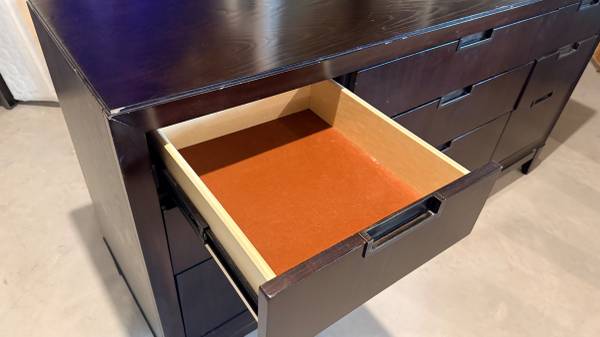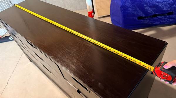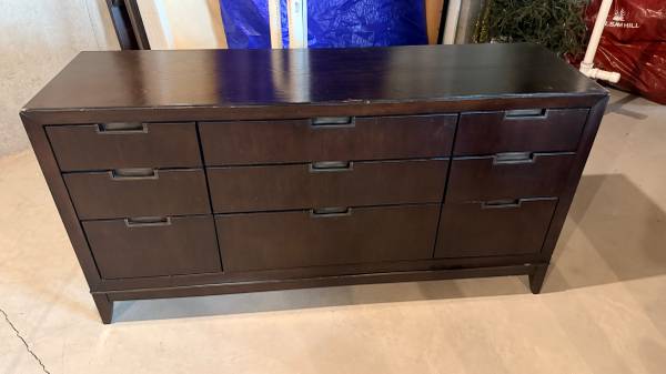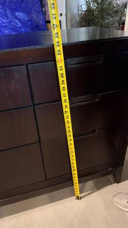 Smoke free home, minor nicks and marks on the dresser, could be touched up if you grabbed a stain stick. All drawers work properly. Dimensions 66" X 19" X 34"