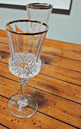 I only have two of these glasses left to sell, so this listing is for the pair. Gorgeous gold-trimmed wine glasses for your next special evening. Gently preowned. Very light wear on gold trim. No chips or defects. Overall excellent condition.