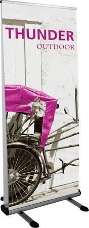 The Thunder Banner Stand is a large, sturdy double-sided outdoor retractable bannerstand. This display is packed with features for added stability and utility, including two large, twist-lock feet, a three-piece bungee pole and stakes to secure the banner