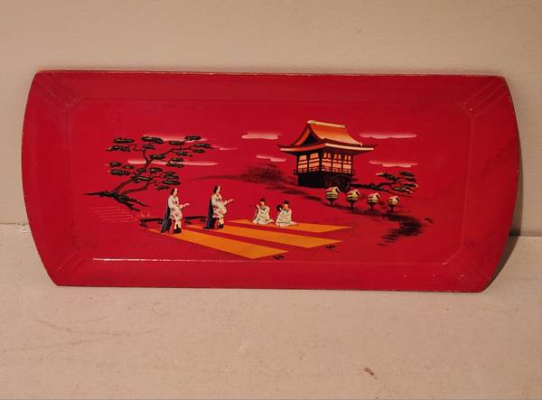 Vintage Red Haskelite Asian Hand Painted Tray Used For Display Only 10 3/4" Long x 5" Wide