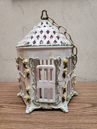 Vintage Decorative Hanging Italian Porcelain Bird Cage Hand Painted Hexagon Shape Door That Opens and Closes 13.5" Tall x 10.5" Wide Can Hang or Set on Table