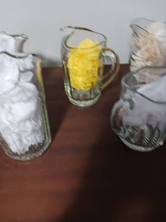 I have 6 crystal pitchers in like new condition. The taller ones measure 8". The smaller one measures 6".All for $25 or I can sell them individually for $7 each. Cash