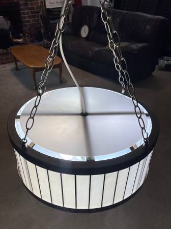 Beautiful Deco Style Pendant Light w/Glass In Lead Construction with 3 Bulb sockets in excellent condition Shown with temporary power cord 20.5x8.5"h Approximately 3' suspension chain W Bloomington