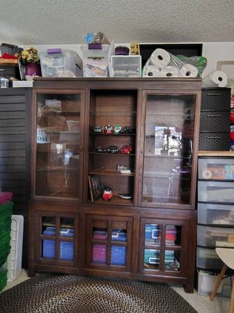 ENTERTAINMENT CENTER WITH 2 GLASS DOORS. IN GOOD CONDITION. $70 59WX74HX13D COMES IN 2 HALFS FOR TRANSPORTATION PURPOSES