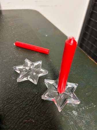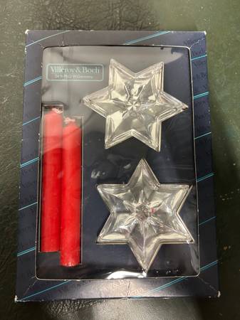 Comes in original box- one candle has been placed in the candleholder to take a picture so now has indentations in the bottom of the candle, but candles have never been lit.