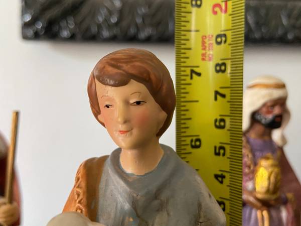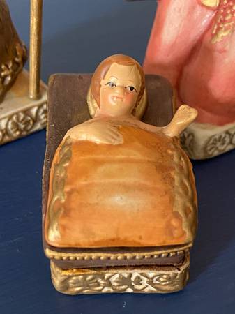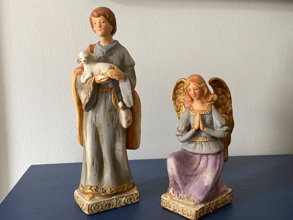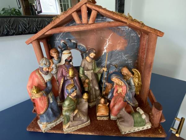 ceramic figures- Jesus, manger, Mary, Joseph, The three Magi -Balthazar, Caspar, Melchior, shepherd, angel, ox, donkey