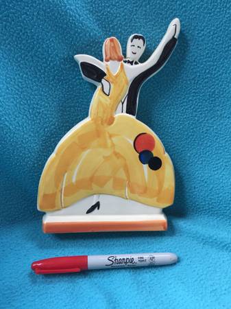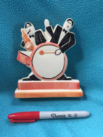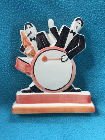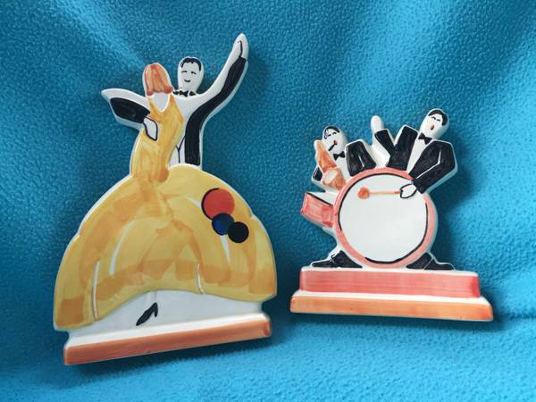 Hand-painted, flat backed, they feature a couple dancing on one and a sax player and drummer on the other.