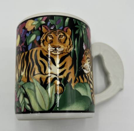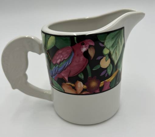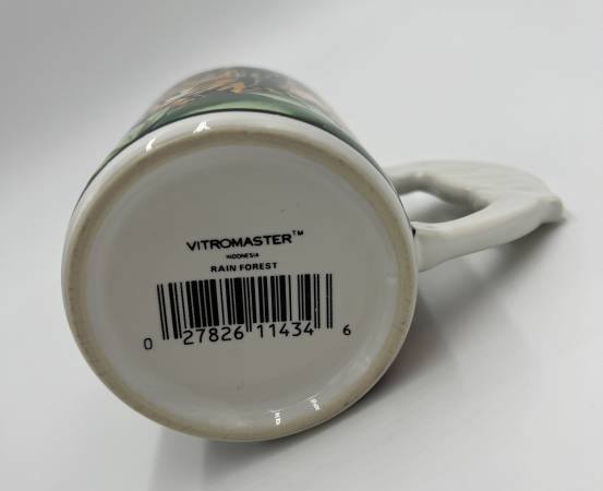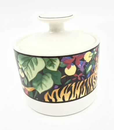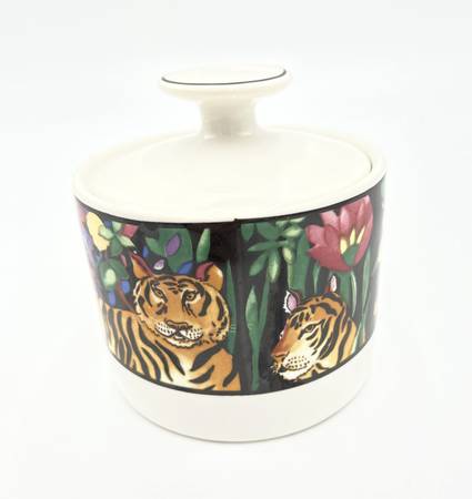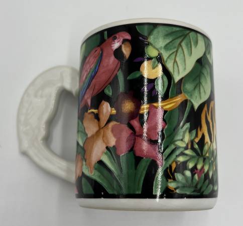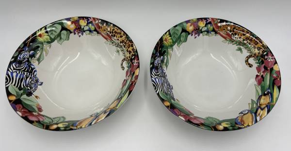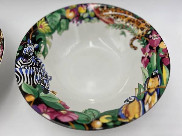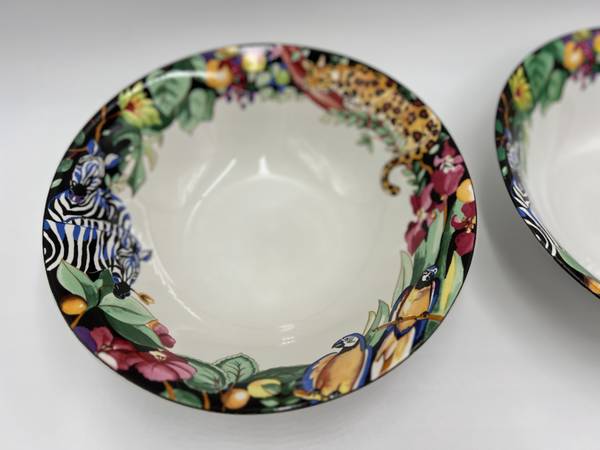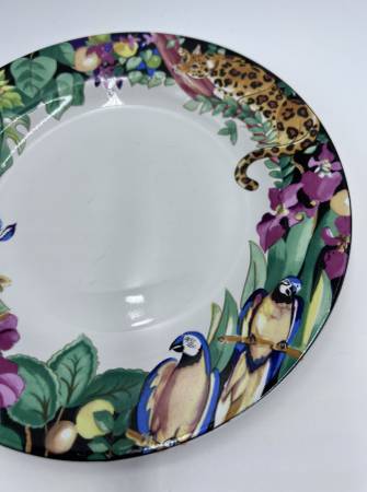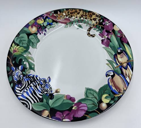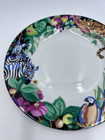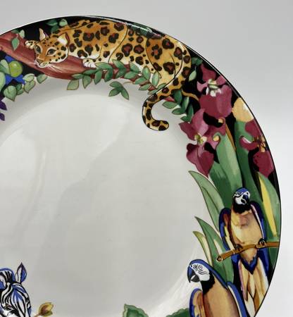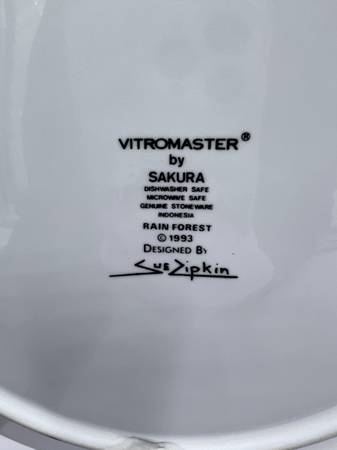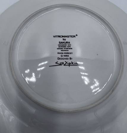 Rare set - Rain Forest design, Vitromaster by Sakura (designed by Sue Lipkin). Genuine stoneware dishes from Indonesia. I purchased this set from Macy's back in 1993 and they have been loved and cared for ever since. Stored safely for the last 15 years. Set contains (12) dinner plates (10 5/8"), (12) salad plates (7 7/8"), (12) mugs (4"), (1) platter (12 1/2"), (10) bowls (7 1/4"), creamer ( 4 1/4"), sugar dish with lid (3 1/8" x 4"), and (2) large serving bowls (9 1/4"). Rainforest design contains parrots, zebras, and leopards along with tropical flowers and fruits. Bright and vibrant! One plate has a small chip on bottom and there is some light utensil scratches, but otherwise these are gorgeous dishes in excellent shape that deserve to be seen and used again! Dishwasher and microwave safe.