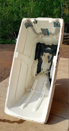 was cut, then repaired with gorilla tape, flexseal, zip-ties and license plates bolted together. Custom. Holds water/Does not leak.