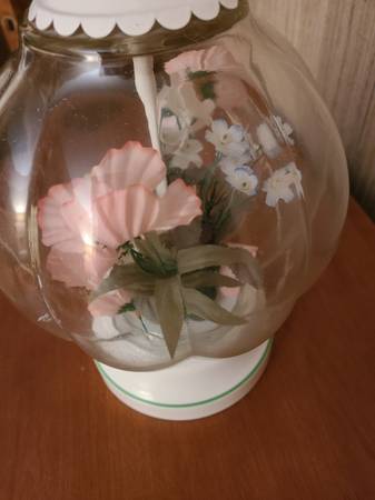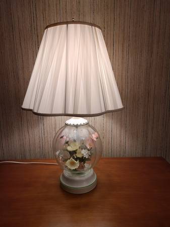 Vintage 3-Way Table Lamp Faux Flowers in Glass Base 25" Tall to Finial 3-Way Light Bulb Not Included Shade has Stain on Outside and Slight Damage on Inside