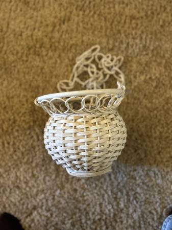 Wicker Plany Holder, 7" high, 8" wide at top, 5" wide at inner ring close to top, and 32" from bottom to hook. $16.00