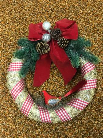 Christmas Wreath, 14" Dia., has cardinal, red bow, green, pine cones and balls. Straw wrapped and corded, tightly wrapped to ensure long life. $12.00