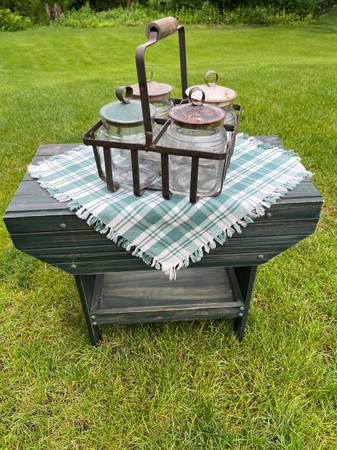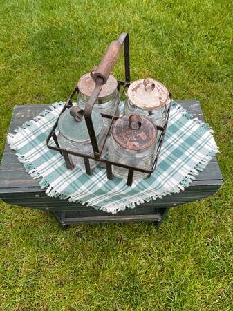 Vintage Glass Ribbed Pantry Bottles With Metal Lids Metal Carrying Basket With Wooden Handle. 5 Piece Handle Folds Down Rare Find! Adorable For Your Farmhouse Kitchen Or Pantry.