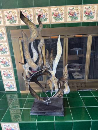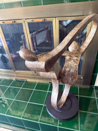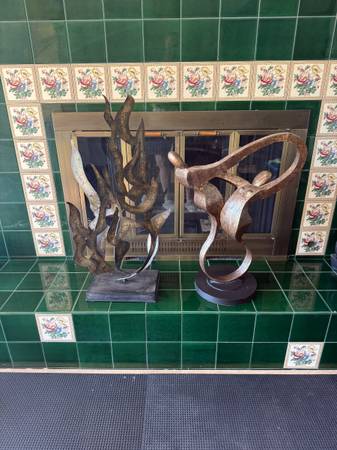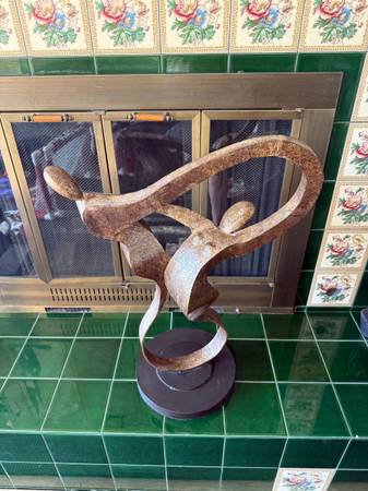 Rejoice sculpture: Large, dramatic and airy. This golden couple is composed of a cascade of curves and angles. 27 1/2”H by 11”W by 17 1/2” L. Flame sculpture: 3D sculpture made of hand forged metal....