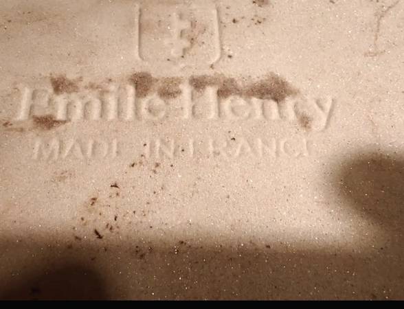 Barely used 14 inch Finished with Emile Henry's proprietary glaze, this pizza stone produces perfectly crispy crusts and doubles as a cutting surface. The piece withstands exceptionally high heat, so it can be used in the oven or on the grill, and it's dishwasher safe.