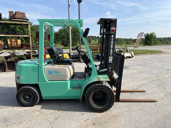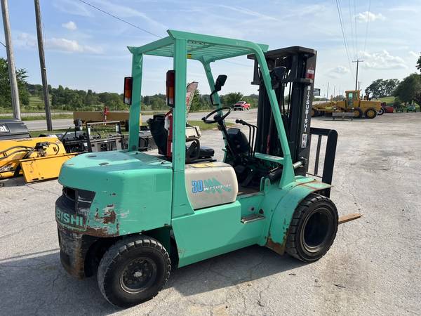 Mitsubishi FD30 Large Dual Pneumatic Tire Forklift, 6300 Hours, 6,000 Lbs Cap., Mitsubishi Gas Engine, auto trans, works great, 6,000 lbs lift, 186" lift height, Brakes and Park Brake are good, Good pneumatic tires, no leaks, Works Good!!! $9,900 call Brandon 712-254-1301 sales tax does apply unless buyer is exempt