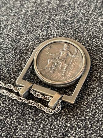 The coin is .925 sterling silver. The setting and necklace are unknown but likely also silver.