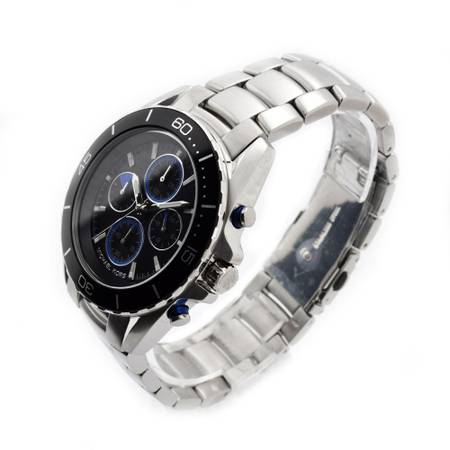 Polished stainless steel case with a stainless steel bracelet. Black dial with silver-toned hands and index hour markers. Minute markers around the outer rim. Dial Type: Analog. Luminescent hands and markers. Chronograph - sub-dials displaying: four - 60 second, 60 minute, 1/10th of a second, 24 hour. Quartz movement. Scratch resistant sapphire crystal. Solid case back. Case diameter: 43 mm. Case thickness: 11 mm. Round case shape. Band width: 20 mm. Deployment clasp. Water resistant at 100 meter / 330 feet. Functions: chronograph, hour, minute, second.
