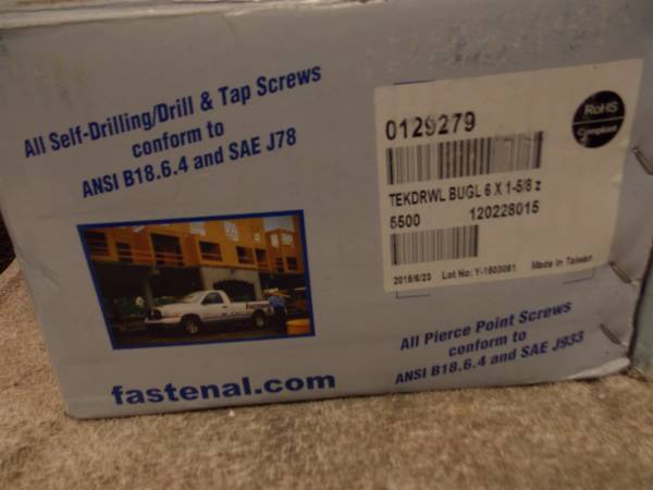 We have (6) Brand new boxes of screws being sold(per box price) The sale price is for one 29 Lb. Box of 5500 Sheet Rock Screws #2 Self-Drilling Point Fastenal Brand Zinc coated Part number for the box is 0129279 .These are #6 -20 Bugle Head Phillips Drive .Dry Wall Screw Self Drilling Bugle Head #6 1-5/8" Zinc Fastenal Box. We have over 4 unopened Boxes of these for sale. These are used for Attaching Gypsum Drywall Sheetrock , Insulation Board or Wood to steel .The price from Fastenal is 203.50 plus tax, so close to 220.00 ,so these are 60% off of New price. There are NOT cheap Import screws but if you've ever used them you know how they can really slow down your work .Call if interested in anything (952)854-5 seven eight six