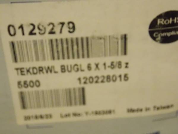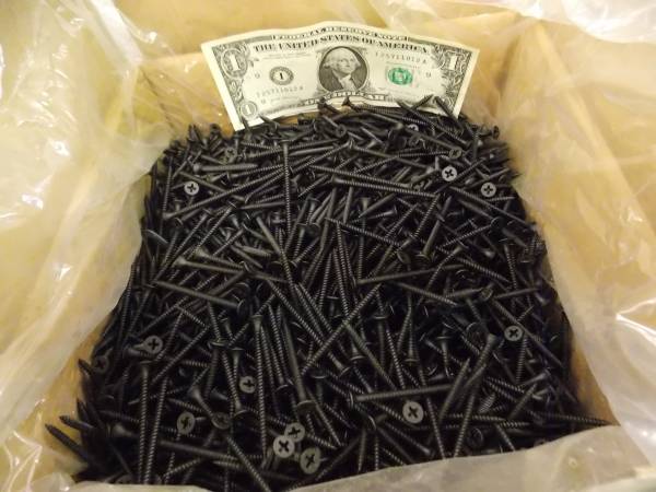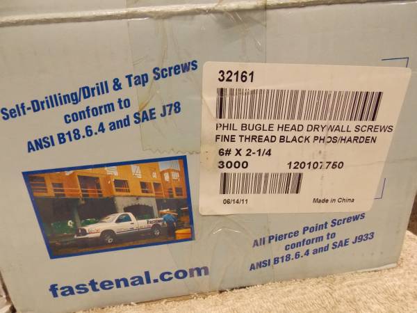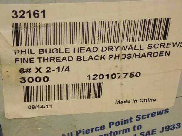 The Box to the right is Fastenal # 6-18 2-1/4" #2 Drive Fine Thread Gray Phosphate Sharp Point Drywall Screw .Fastenal Part Number 32161 Box of 3000 .Price from Fastenal is 222.00 plus tax is 239.00 so these are over 60% off for box of 3000 at 89.00 here .We have 2 boxes of these.