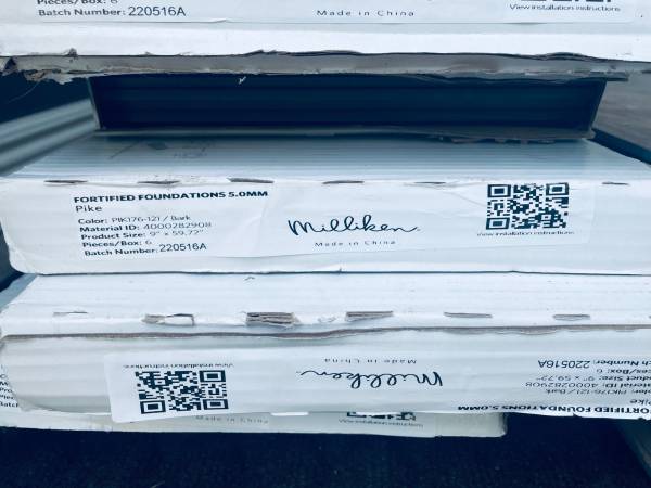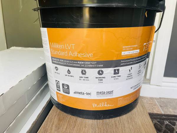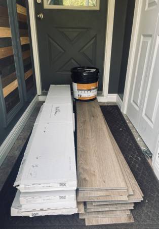 HI, here are some Milliken Pike, Bark colored vinyl floor, that you free lay with with perimeter glue. 6 boxes, 2-planks short of 5 boxes loose. Also includes an almost full bucket of glue. Some of the loose were laid down, then removed when it was decided it was not going to be right with the room. most everything scraped off, an example is the last pic.